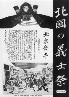 赤穂浪士の熱烈な崇拝者だった初代住職(現住職は4代目)が、四十七士のお墓のある本家、芝・髙輪泉岳寺に、義士墓建立と寺名の変更を陳情、当初は許可が出ませんでした。時が経ち2代目住職(初代の孫)が祖父の志を受け継ぎ、何度も陳情を続け、昭和27年12月初旬、ようやく泉岳寺より内諾の吉報を受けることができました。その後、昭和28年2月4日、つまり四十七士切腹の日に、泉岳寺より「北泉岳寺と名のってもよい」という承認書が届き、大石内蔵助はじめ義士の墓の土を四十七個の木箱にわけて持ち帰り、昭和31年に墓所をつくり、盛大な開眼、入魂祭を挙行したのです。「北海道義士祭」は、こうした祖先の功労を経て、今も、討ち入りの12月14日に開かれている伝統のお祭です。